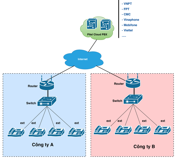 - Mô hình này cũng cần phải có nhân sự quản trị hệ thống. Có thể thuê dịch vụ quản trị tổng đài bên ngoài từ Pitel Shopping để có nhân sự hỗ trợ kỹ thuật 24/7 và SLA tiếp nhận dịch vụ trong 30 phút.