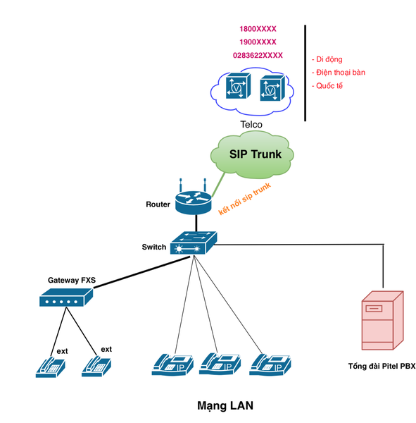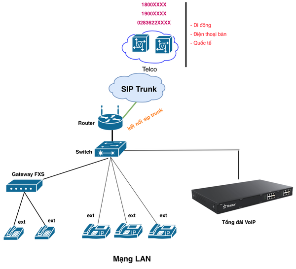 - Các hãng có thể lựa chọn: Yeastar, Grandstream UCM, Sangoma,....