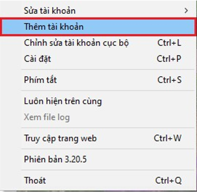 Bước 3: Chúng ta chọn vào "menu", chọn "thêm tài khoản" để tích hợp tài khoản vào tổng đài thì mới thực hiện nghe gọi, các nghiệp vụ tổng đài của Pitel cung cấp.