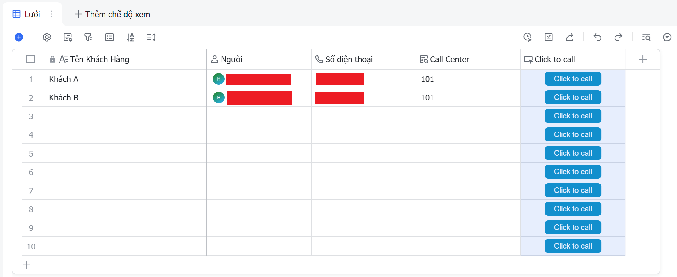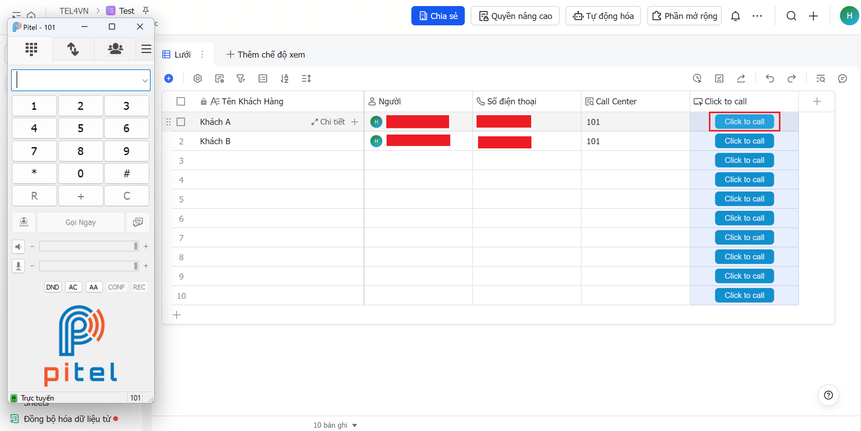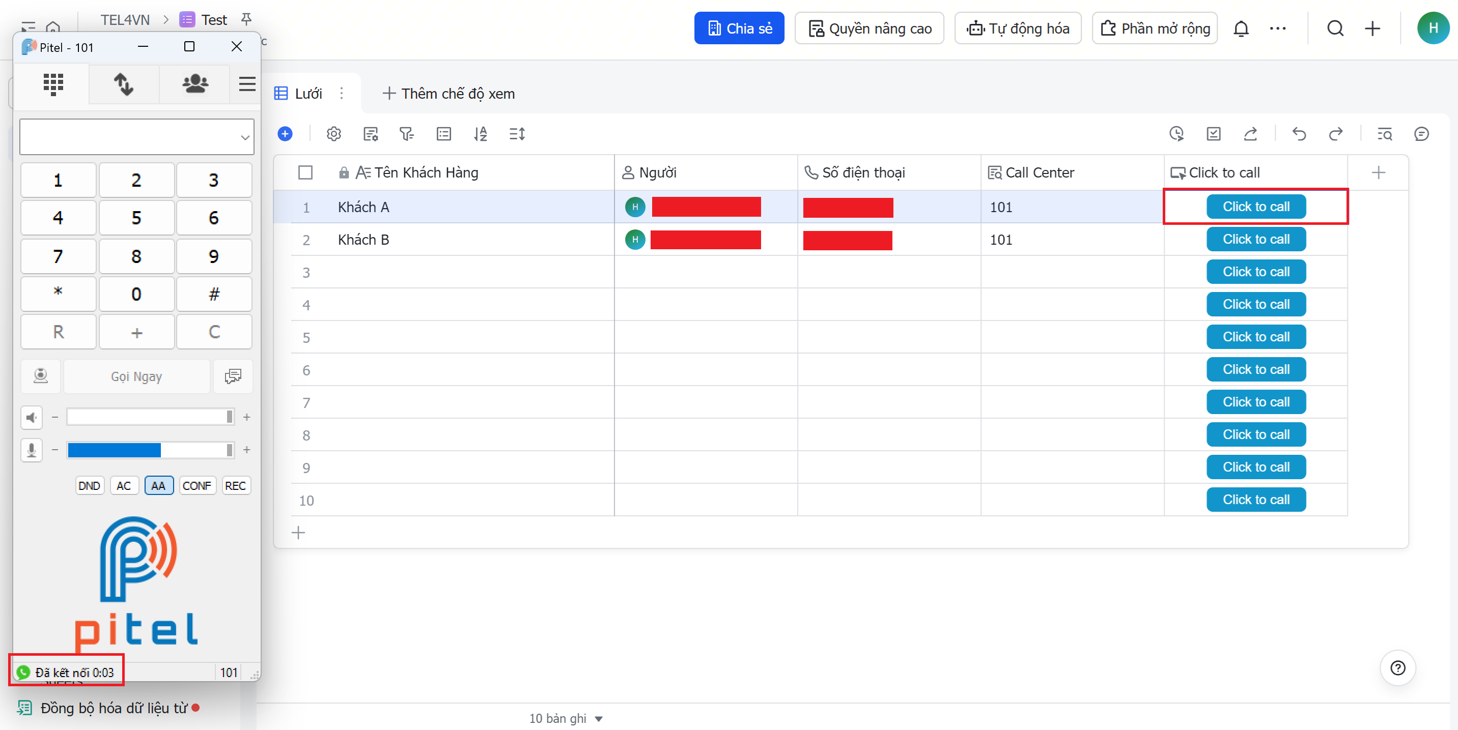 Bước 8: Từ danh sách khách hàng, bấm nút “click to call” để thực hiện gọi, tín hiệu sẽ được truyền tự động sang app Pitel trên PC hoặc Mobile để thực hiện gọi ra cho khách