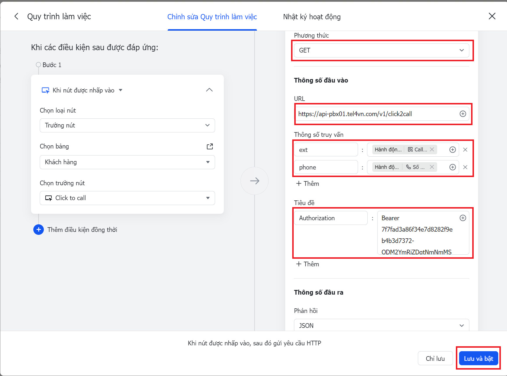 - Giá trị: Bearer {token} (mã token thì liên hệ Pitel để được cấp)