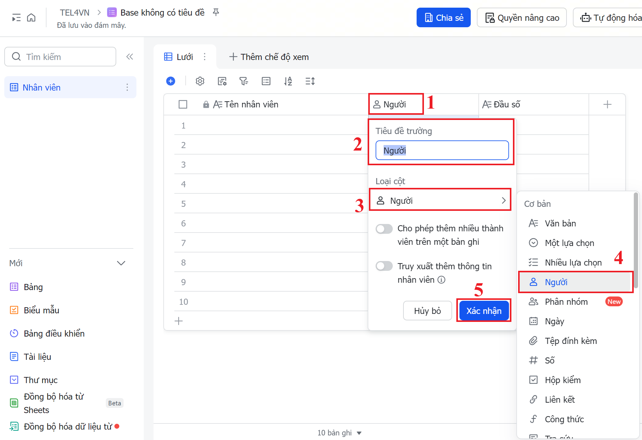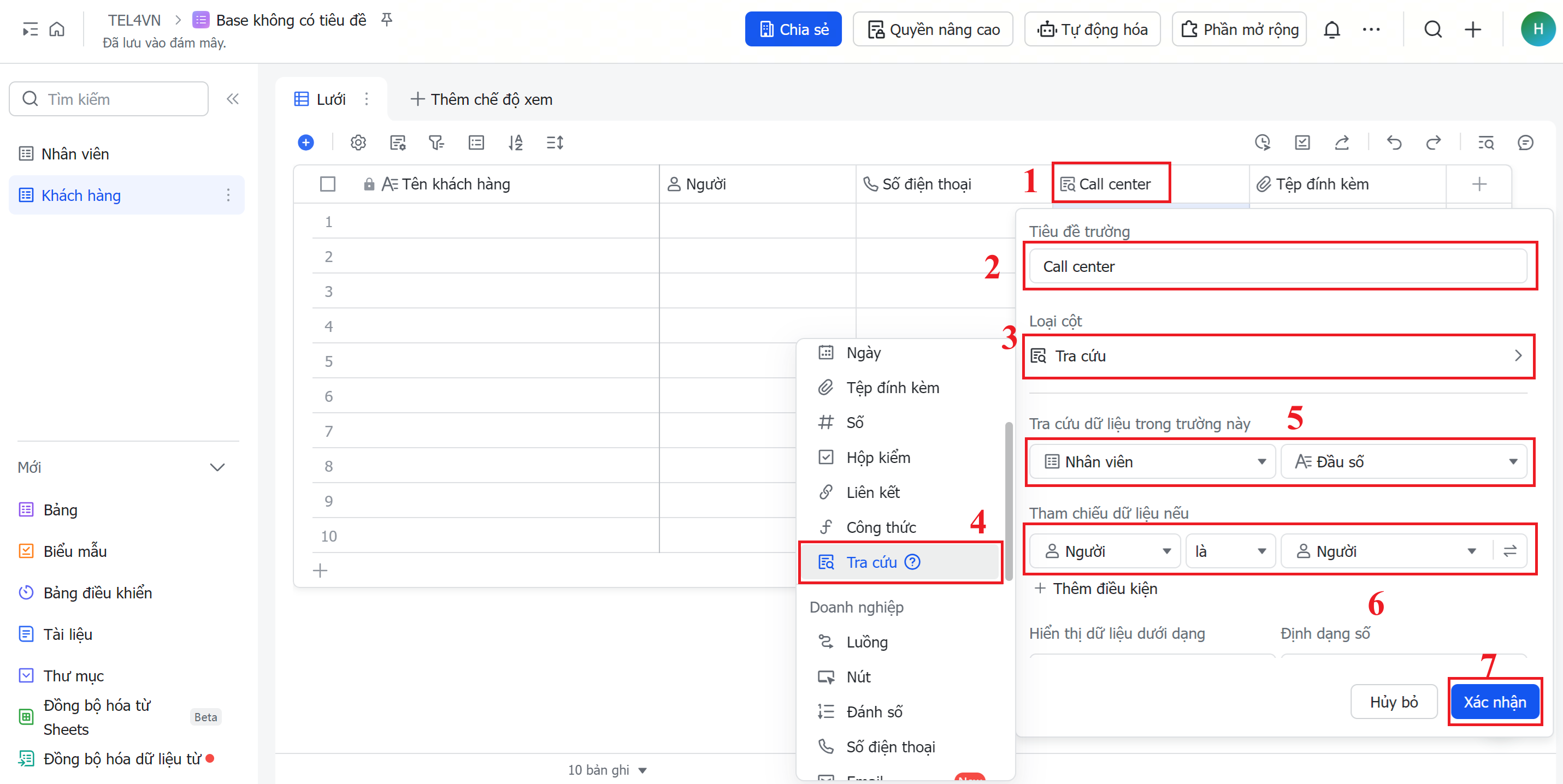 - Tra cứu dữ liệu trong trường này: chọn bảng "Nhân viên", trường dữ liệu "Đầu số"