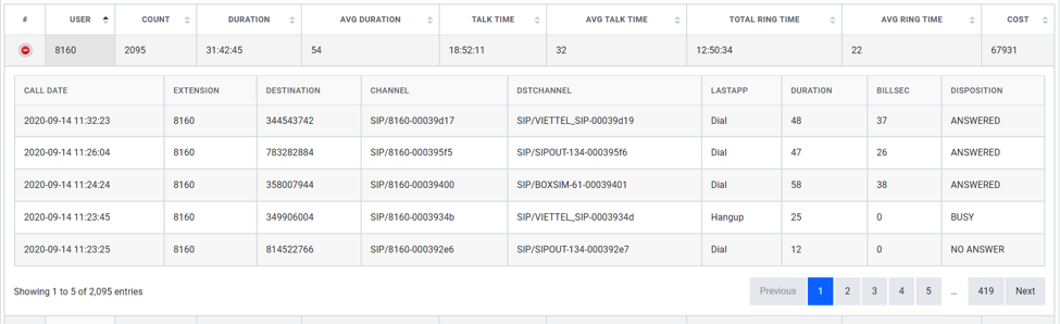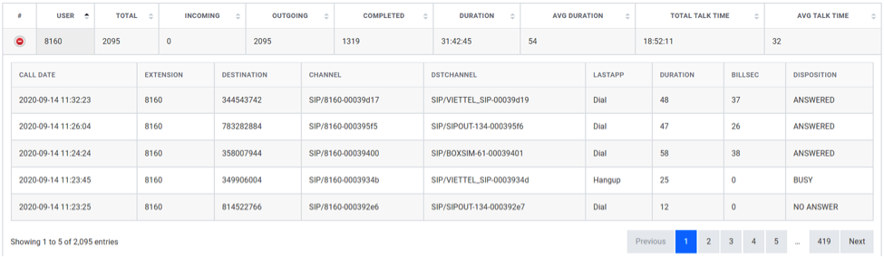 Hình 14. Chi tiết cuộc gọi của từng extension
