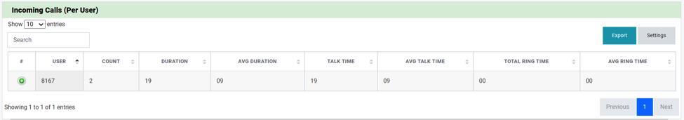 Hình 16. Bảng thống kê cuộc gọi theo chiều vào của các extension