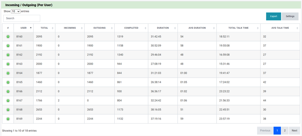 Hình 19. Bảng thống kê cuộc gọi theo 2 chiều của các extension